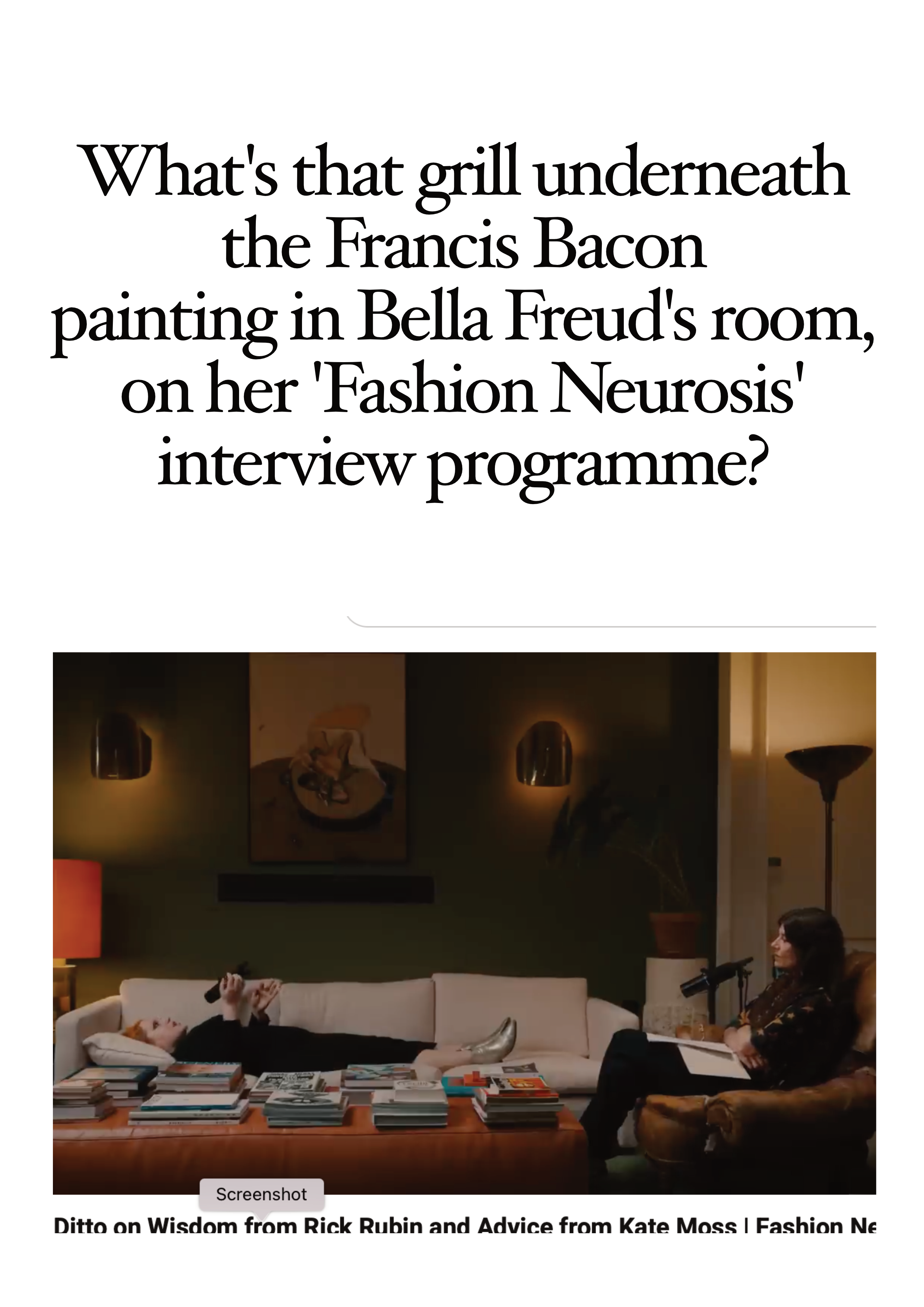 I’m sitting watching the Bella Freud interview programme ‘Fashion Neurosis’ on YouTube. It’s very interesting. Freud interviews her special guests in a ‘Freudian’ manner (Bella Freud is Sigmond Freud’s great-granddaughter). Lots of questions about fashion, family, relationships and sex. She sits to the right in a big leather armchair, while her guest is lying on a large cream coloured sofa. There is a camera directly above the guests’ head and shoulders, so a lot of the time I am looking at their face as they speak. The angle makes their faces look good. They look relaxed. Through Freud’s questions and conversation, I realise that they are very familiar with each other, and the people they know. They have lots in common. They name drop with abundance, but that’s okay, I learn things –