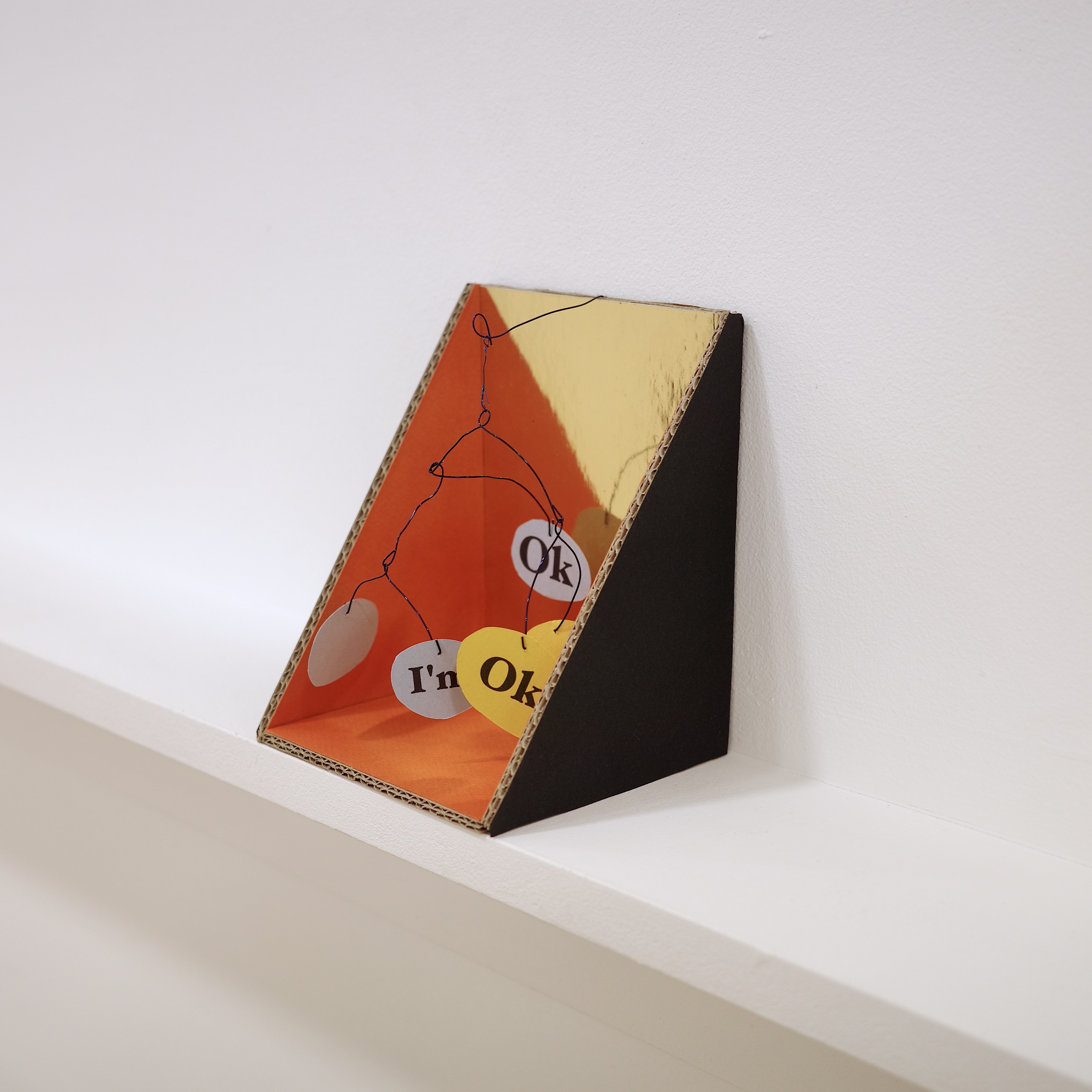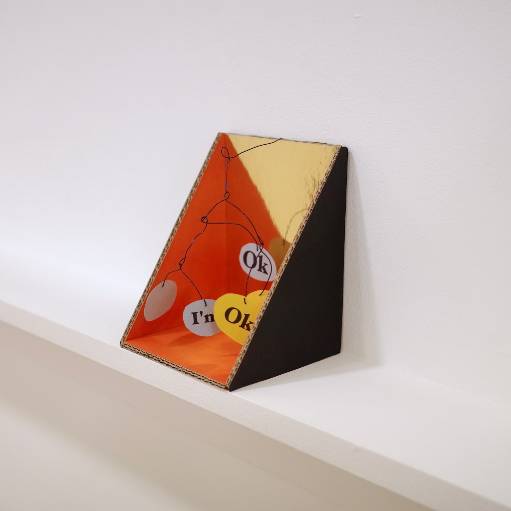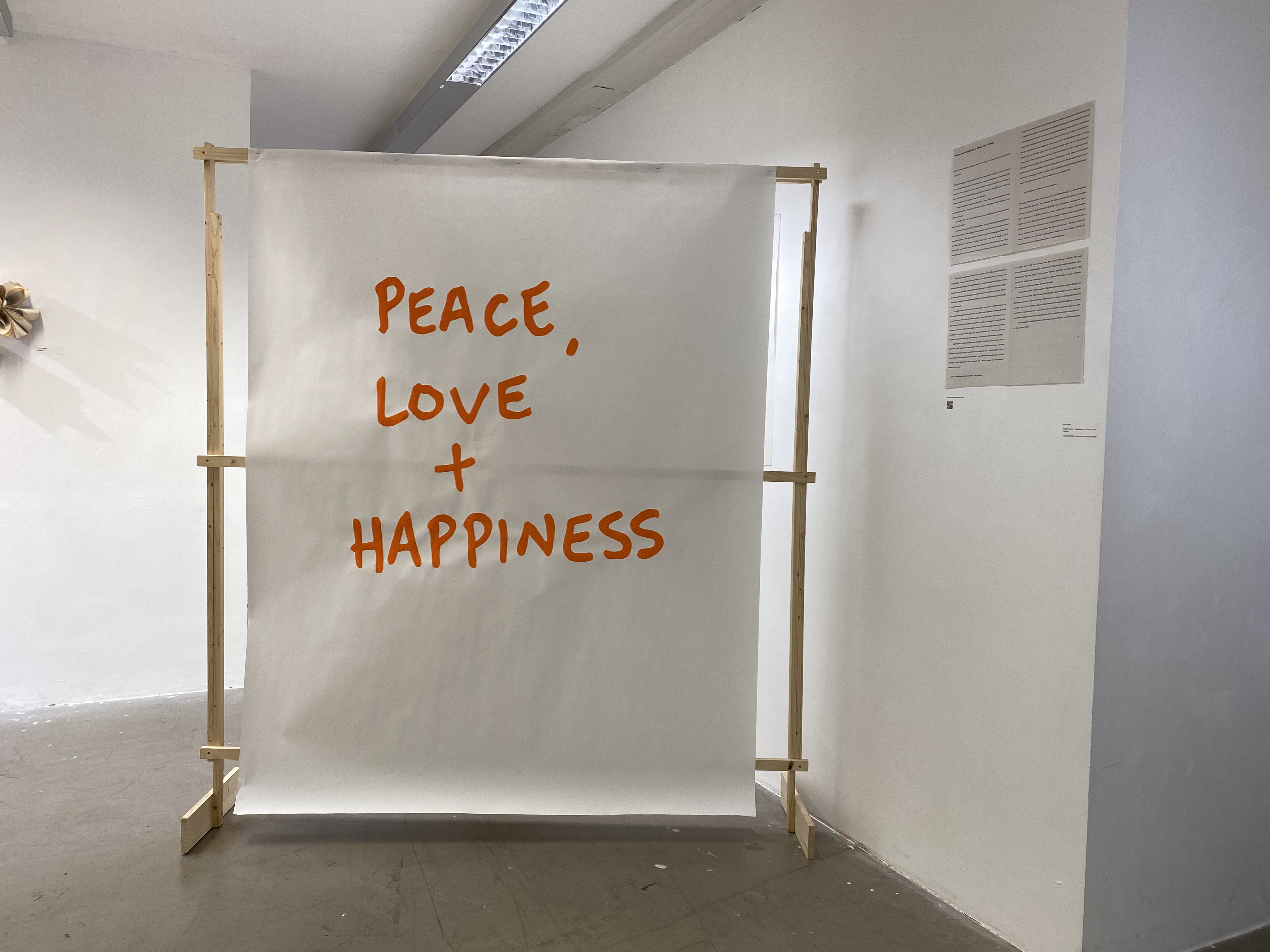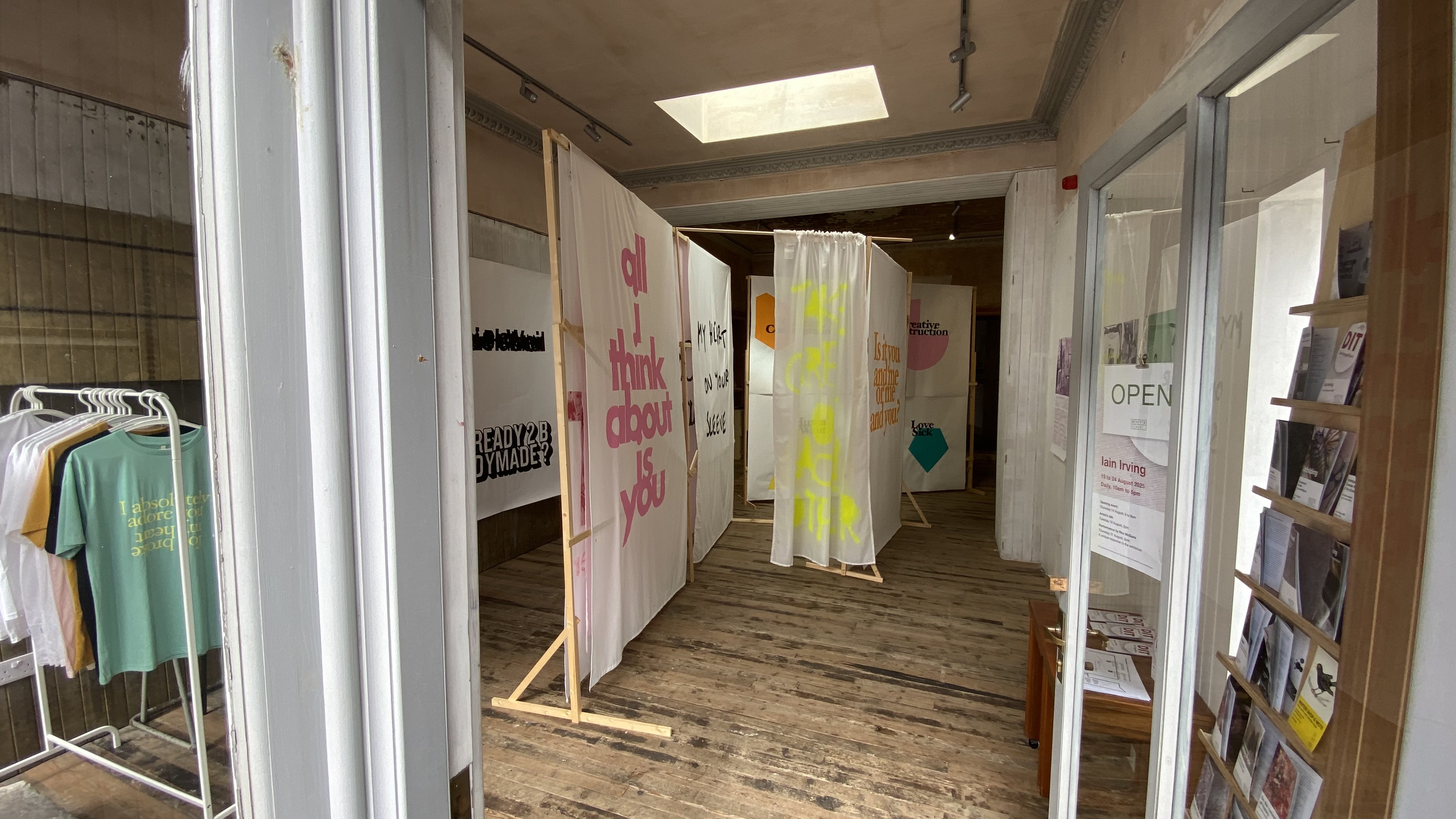 Text banner installation, made with wood, acrylic on paper, and domestic cotton fabrics from IKEA and John Lewis, express feelings that we have—our needs, wants, desires; but they can also be contradictory about how we take care of each other and things.