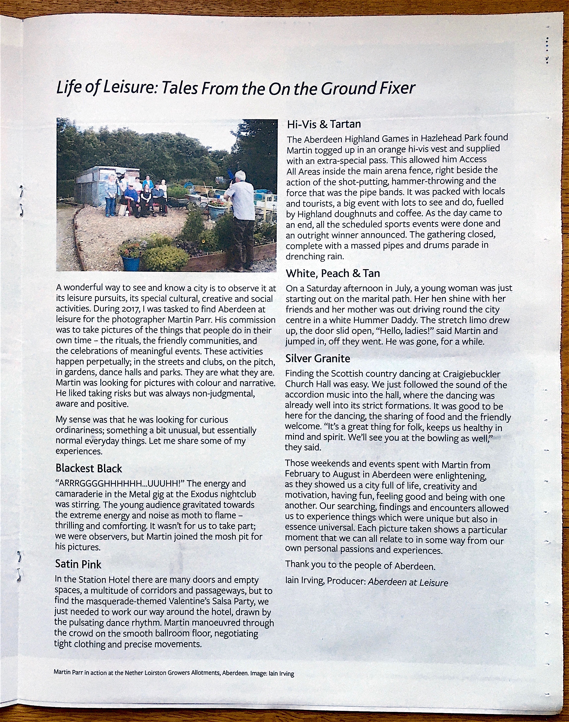 A wonderful way to see and know a city is to observe it at its leisure pursuits, its special cultural, creative and social activities. During 2017, I was tasked to find Aberdeen at leisure for the photographer Martin Parr. His commission was to take pictures of the things that people do in their own time – the rituals, the friendly communities, and the celebrations of meaningful events. These activities happen perpetually; in the streets and clubs, on the pitch, in gardens, dance halls and parks. They are what they are. Martin was looking for pictures with colour and narrative. He liked taking risks but was always non-judgmental, aware and positive.
