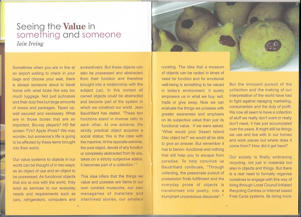 This idea infers that the things we value and possess are items in our own little curated museums, our own menageries of materials and interlinked stories, our amateur curating. The idea that a museum of objects can be raided in times of need for function and for emotional well‐being is something to be valued in today’s environment. It surely empowers us in what we buy, sell, trade or give away. Now we can evaluate the things we possess with greater awareness and emphasis on its subjective value than just its functional value. If we were asked, “What would your Desert Island Disc object be?” we would all be able to give an answer. But remember it has to be non‐functional and nothing that will help you to escape from paradise. To help convince us Baudrillard continues, “Through collecting, the passionate pursuit of possession finds fulfilment and the everyday prose of objects is transformed into poetry, into a triumphant unconscious discourse”[ii].