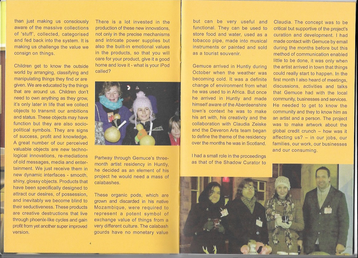 I had a small role in the proceedings as that of the Shadow Curator to Claudia. The concept was to be critical but supportive of the project’s curation and development. I had made contact with Gemuce by email during the months before but this method of communication enabled little to be done, it was only when the artist arrived in town that things could really start to happen. In the first month I also heard of meetings, discussions, activities and talks that Gemuce had with the local community, businesses and services. He needed to get to know the community and they to know him as an artist and a person. The project was to make artwork about the global credit crunch – how was it affecting us? – In our jobs, our families, our work, our businesses and our consuming.