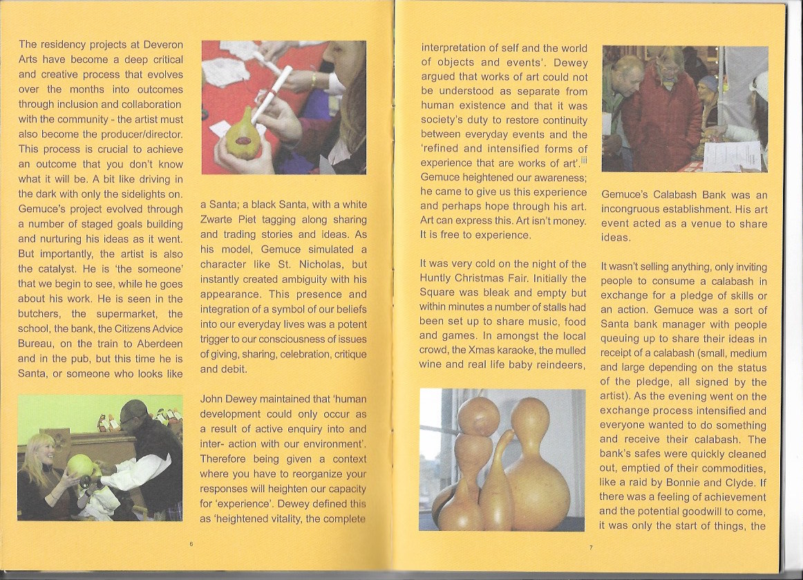 It wasn’t selling anything it wasn’t asking us to consume, only to consume a calabash in exchange for a pledge of skills or an action. Gemuce was a sort of Santa bank manager with people queuing up to share their ideas in receipt of a calabash (small, medium and large depending on the status of the pledge, all signed by the artist). As the evening went on the exchange process intensified and everyone wanted to do something and receive their artwork. The bank’s safes were quickly cleaned out, emptied of their commodities, like some raid by Bonnie and Clyde. But there was an intense feeling of achievement and of the potential goodwill to come, it was only the start of things, the pledges (like, we really need a garden centre here; or the Square should be closed to traffic) still had to be carried out, we had been encouraged to think about what our own gifts were and how we can share them with the community.
