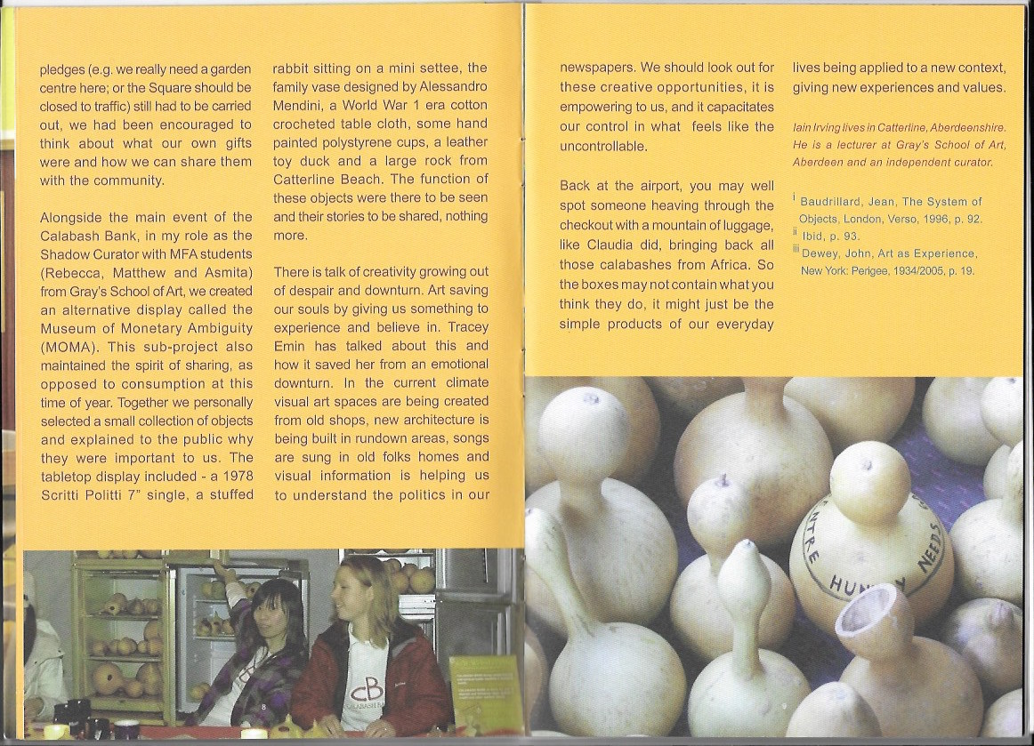 Alongside the main event of the Calabash Bank, in my role as the Shadow Curator with MFA students (Rebecca, Matthew and Asmita) from Gray’s School of Art, we created an alternative display called the Museum of Monetary Ambiguity (MOMA). This sub‐project also maintained the spirit of sharing at this time of year, as opposed to consumption. We created a small collection of personally selected objects that we wanted to share with the public, and tell them about why they were important to us. The tabletop display included – a 1978 Scritti Politti 7” single, a stuffed rabbit sitting on a mini settee, The Family Vase designed by Alessandro Mendini, a World War 1 era cotton crocheted table cloth, some hand painted polystyrene cups, a leather toy duck and a large rock from Catterline Beach. These objects were just there to be seen and their stories to be shared, nothing more.