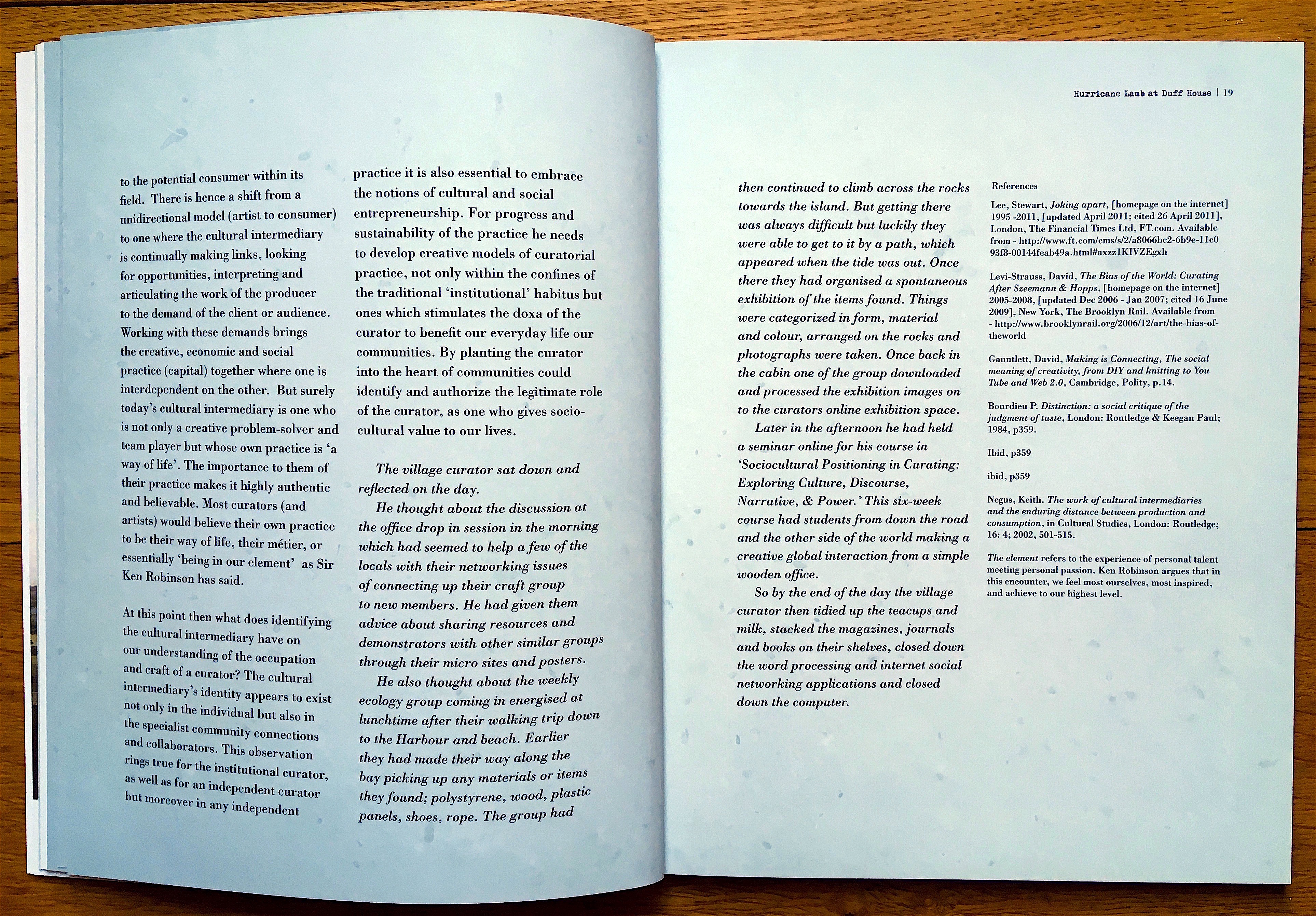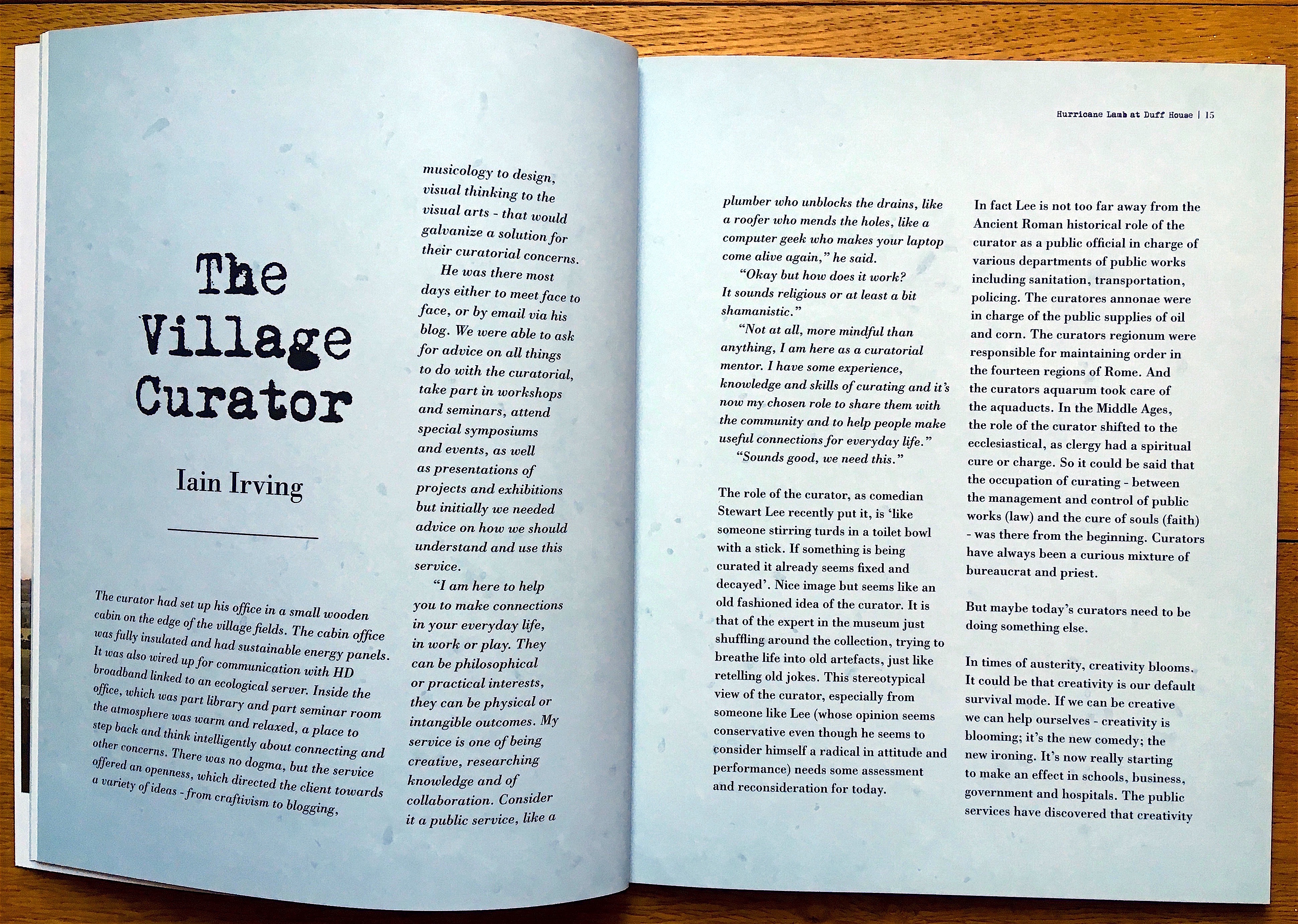 The curator had set up his office in a small wooden cabin on the edge of the village fields. The cabin office was fully insulated and had sustainable energy panels. It was also wired up for communication with HD broadband linked to an ecological server. Inside the office, which was part library and part seminar room the atmosphere was warm and relaxed, a place to step back and think intelligently about connecting and other concerns. There was no dogma, but the service offered an openness, which directed the client towards a variety of ideas ‐ from craftivism to blogging, musicology to design, visual thinking to the visual arts ‐ that would galvanize a solution for their curatorial concerns.